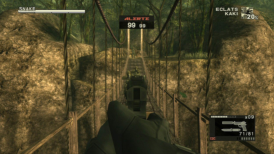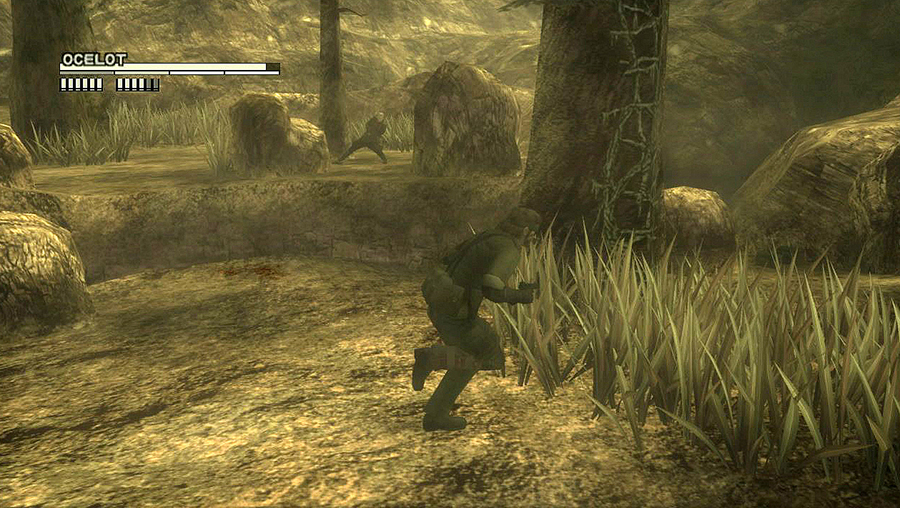 Tout cela n’est pas que théorique. Le gameplay de Snake Eater, plus complet que jamais, est aussi plus organique — plus sensoriel. Années 60 obligent, le radar qui indique à Snake la position des ennemis n’est finalement pas très utile, tant son utilisation semble archaïque. Plus que jamais, il faut être patient dans ce Metal Gear Solid 3. Il faut observer son environnement, écouter les bruits naturels à la recherche de dysfonctionnements — tout ce qui pourrait indiquer une présence hostile. Il faut régulièrement changer de camouflage, marcher très doucement dans le dos des ennemis… Des tas de nouveautés à appréhender pour se glisser dans la peau de John, l’enfant qui devient animal, l’animal qui deviendra un homme à part entière.